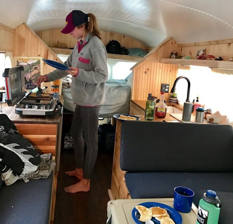 29-летний фельдшер Мэтт и его 28-летняя жена Эмили, которая работает учителем средней школы, из штата Мичиган потратили пять месяцев и более $17 700, чтобы превратить старый школьный автобус в уютный дм на колесах. Столярное и слесарное дело они изучали, просматривая обучающие ролики на YouTube. Теперь, в свободное от работы время, пара путешествует по США в собственном доме на колесах.