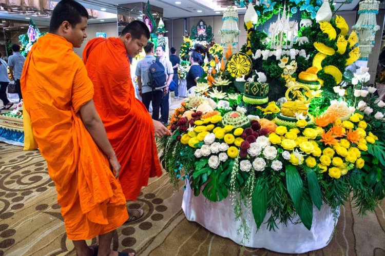 Эта цветочная композиция, которую разглядывают монахи – тоже фрукты и овощи после карвинга: