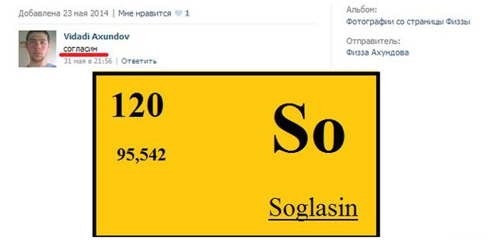 «Новые элементы» таблицы Менделеева 15-02-2016, 11:09 BigSisa Картинки 3 493 Некоторые слова, какие с оплошками катают пользователи сети, похожи на звания каких-то новоиспеченных доселе безвестных химических элементов таблицы Менделеева. Если Вам понравилось, поделитесь с друзьями в соцсетях: Предыдущая новость Следующая новость