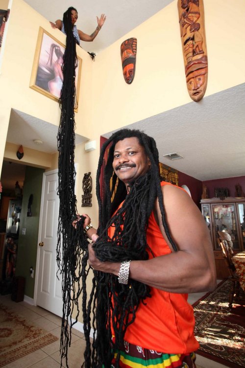 Обладательница самых длинных волос в мире вышла замуж за парикмахера, который тратит по два дня на то, чтобы вымыть и высушить ее дреды.