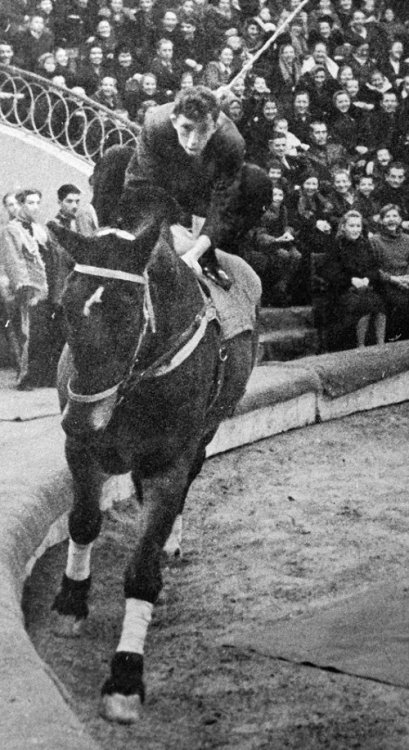 Молодой клоун Юрий Никулин изображает "человека из публики", который впервые сел на лошадь, 1947 год, Москва