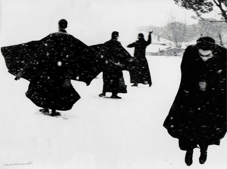 В 1961-63 годы Марио Джакомелли документировал католические семинарии в послевоенной Италии, и заинтересовался жизнью молодых священников. Фотограф запечатлел их на досуге, за простыми радостями – игрой в снежки, танцами и хороводами. Эти фотографии сделали Джакомелли известным во всём мире.