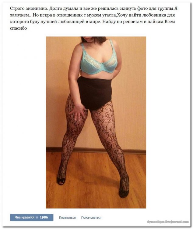 Дамам очень секаса не хватает (часть 18) 11-04-2016, 21:00 BigSisa Интересное 3 539 Очередная партия веселых дам из групп "Знакомства со зрелыми" и т.п., которые ищут в интернете приключения на свою задницу (и не только). Если Вам понравилось, поделитесь с друзьями в соцсетях: Предыдущая новость Следующая новость