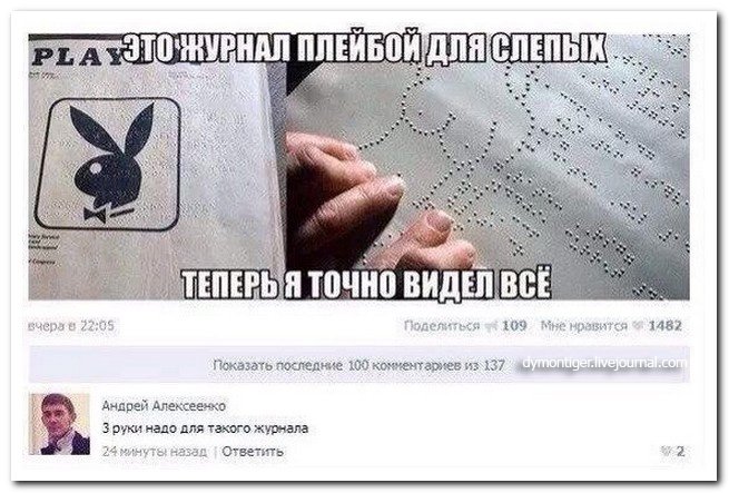 Смешные комментарии из социальных сетей 15.04.16 15-04-2016, 10:00 BigSisa Интересное 3 302 Очередная подборка смешных высказываний и комментариев из социальных сетей и других частей интернета. Если Вам понравилось, поделитесь с друзьями в соцсетях: Предыдущая новость Следующая новость