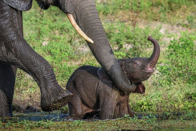 Маленький слоненок упал в глубокую лужу и не мог никак выбраться. На его счастье рядом была мама-слониха, она обхватила своего ребенка крепким хоботом и помогла выбраться из лужи. Эти драматические кадры снял фотограф из Южной Африки Нил Купер на реке Чобе, Ботсвана.