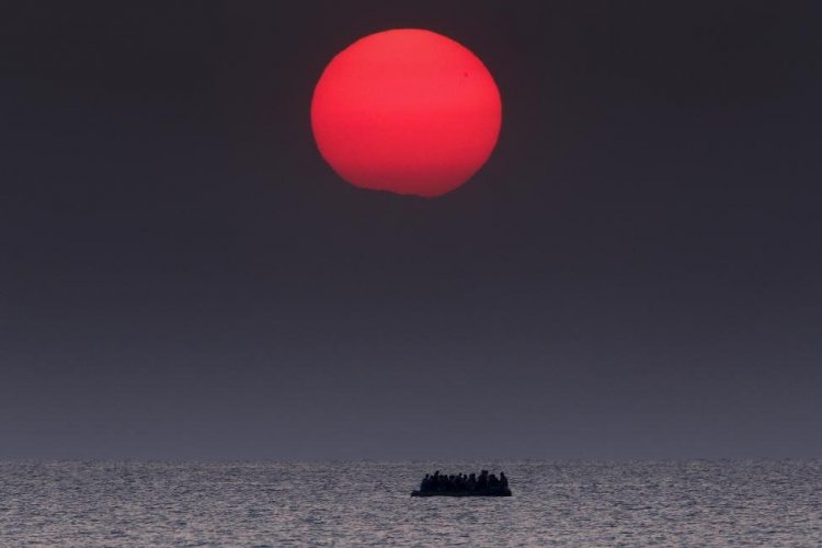 Надувной плот, переполненный беженцами, дрейфует в Эгейском море между Грецией и Турцией. Его мотор сломался. 11 августа 2015 года.
