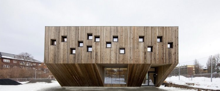 Современное здание площадью 1200 квадратных метров расположено среди жилых домов, отстроенных в 1900–1950 годы, рядом с небольшим городским парком. Оно поделено на 4 блока, способных функционировать как по отдельности, так и вместе. Все блоки объединены посредством зоны общего пользования и кухни, расположенных в самом сердце здания. Офис руководства спроектирован на втором этаже детского сада. В целом данный проект отличается интересной архитектурной задумкой, необычные формы здания стимулируют творческое развитие маленьких граждан, которых администрация города по праву рассматривает в качестве будущего страны, стремясь всячески стимулировать и направить бесценный потенциал.