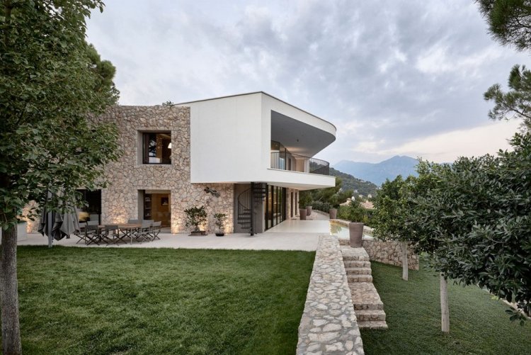 Фасад дома облицован камнем в соответствии с последними популярными тенденциями. «Холодность» камня компенсируют зеленые насаждения и идеальные газоны.