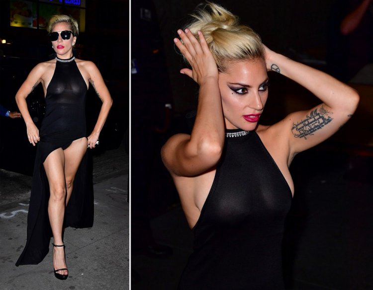 30-летняя американская певица и актриса Леди Гага (Lady Gaga) в черном просвечивающемся платье без бюстгальтера ночью в Нью-Йорке...