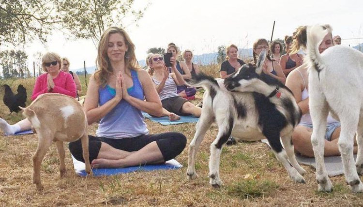 Лэйни Морз, владелица фермы в долине Уилламетт, штат Орегон, организовала занятия по йоге на свежем воздухе, во время которых среди участниц бродят козлы. Некоторые из них даже забираются на женщин во ...
