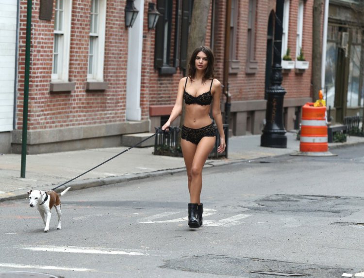 25-летняя американская модель и актриса Эмили Ратаковски (Emily Ratajkowski) на съемках в белье DKNY с собачкой в Манхэттене...