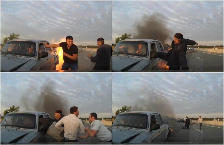 Драматические кадры снял видеорегистратор 9 июля на трассе Ростов–Баку в Ингушетии. Автомобиль «Волга» объезжал аварию, когда ему в зад въехал автомобиль «Лада». От удара заклинило двери и вспыхнул пожар ...