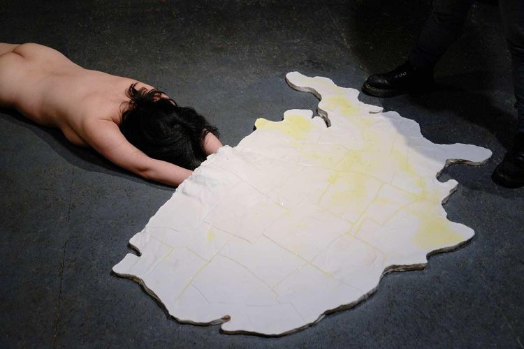 Сегодня на линии художница из Монреаля с типично канадским именем Chun Hua Catherine Dong. Полгода назад в Нью-Йорке Катерина представила перфоманс под названием Границы (The Borders). Посетителям, зашедшим в зал, поначалу предстала такая картина. Художница, лежа голышом на полу, на вытянутых руках держала гипсовую карту Америки.