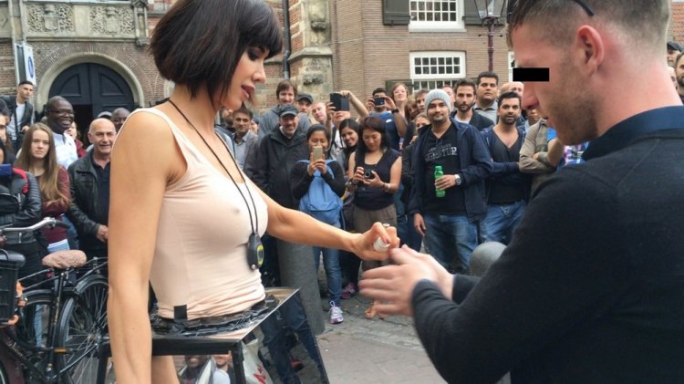 Швейцарская художница Мило Муар, прославившаяся благодаря скандальным перфомансам, предлагала жителям Лондона потрогать ее гениталии.