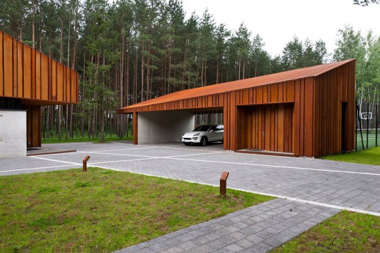 A House in the Woods это проект литовской студии дизайна Studija Archispektras представленный в 2011 году. Частный дом получил такое название из-за своего расположения в пригороде города Каунас, Литва. Снаружи дом покрыт композитными стальными листами и большими окнами. В интерьере широко использованы различные породы дерева и декорированный бетон — плиты отшлифовали и обработали защитным покрытием. Сочетание дерева и бетона придает интерьеру некий стиль современности а большие панорамные окна дополняют его красотой окружающей природы. Во всех комнатах использованы подвесные осветительные системы, благодаря которым свет можно настроить так как необходимо. Пожалуй, именно о таком доме мечтает каждый мужчина.
