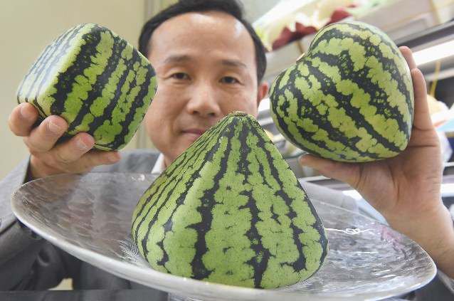 Японские фермеры выращивают арбузы квадратной формы последние 40 лет. Арбузы помещают в кубическую форму, а когда арбузы заполняют ее, их собирают. Обычно такие арбузы еще незрелые и продаются в качестве сувенира или подарка, а их цена может достигать около 100 долларов. Изначально их выращивали для того, чтобы они лучше помещались в стандартные холодильники. Недавно фермеры стали выращивать арбузы в форме сердца, пирамид и даже лица человека.