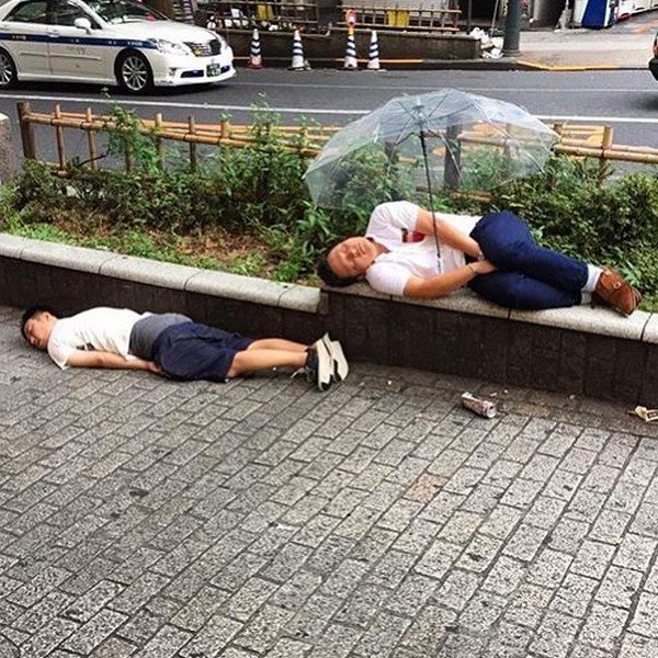 В Токио есть район Сибуя, он известен бурной ночной жизнью и молодежной модой. В этом районе чаще, чем в других частях города, можно увидеть граждан, спящих в самых разных местах. В Instagram есть аккаунт @shibuyameltdown, где собраны снимки с подобными товарищами.