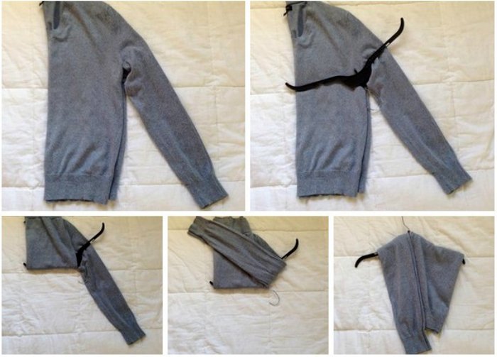 Ширина плеч свитеров зачастую больше, чем размер вешалок. Из-за этого кофты постоянно соскальзывают, а иногда и растягиваются. Чтобы избежать таких неприятностей, попробуйте не вешать, а складывать свитера на вешалке. Для этого, складываем кофту пополам, кладем вешалку так, чтобы крючок оказался под мышкой, и оборачиваем одежку вокруг лопастей вешалки.