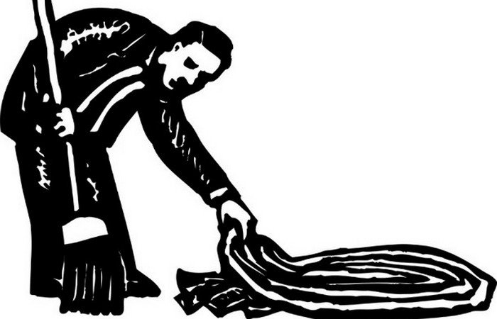 Можно аккуратно подмести мусор и отнести выбросит его в ведро. Но зачем заморачиваться, если можно запихнуть его ногой под ковер или холодильник.