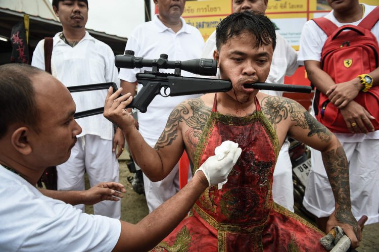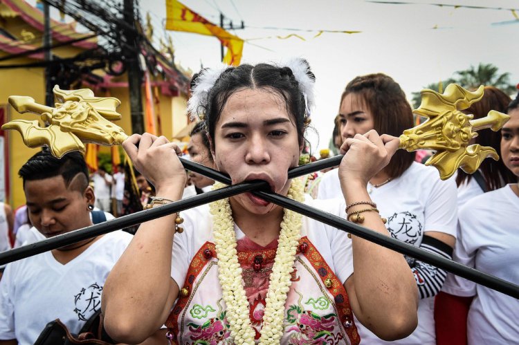 Каждый год в Южной провинции Пхукет (Таиланд) проходит Вегетарианский фестиваль 2016. Он начинается с первым днем девятого лунного месяца по китайскому календарю — как правило, это конец сентября или начало октября и продолжается девять дней. Все это время буддисты соблюдают вегетарианскую диету, не употребляют мясные и рыбные блюда. Так они очищают свое тело и укрепляют дух, но самые страшные вещи происходят во время шествия по центру города Пхукет. Считается, что если в эти дни человек испытает сильное физическое страдание, его душа очистится, а удача будет сопутствовать весь год. Вот участники фестиваля и измываются над собой, кто на что горазд.