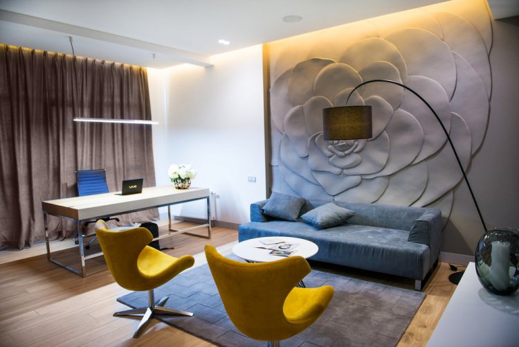 Цвет интерьера подчёркивает архитектуру пространства. Серо-белая гамма и использование дерева определили основу цветовой палитры, а жёлтый и синий являются акцентами. Для придания интерьеру динамики в каждое помещение добавили барельеф. С этой же целью все двери заменены высотой до потолка, которые легко скрываются в стенах, раскрывают пространство и объединяют все зоны воедино. Кухня выполнена из шпонированой фанеры, все детали скрыты в системе хранения. Среди отделочных материалов выделяются мрамор, каменная ванная и умывальники, разбавленные сочетанием дерева и стекла, бетона и скульптурной лепки стены. В качестве дополнения использовались интересные элементы декора, такие как вазы ручной роботы, правильный свет и, конечно же, портьеры, которые создают видимость бесконечного открытого пространства окон.