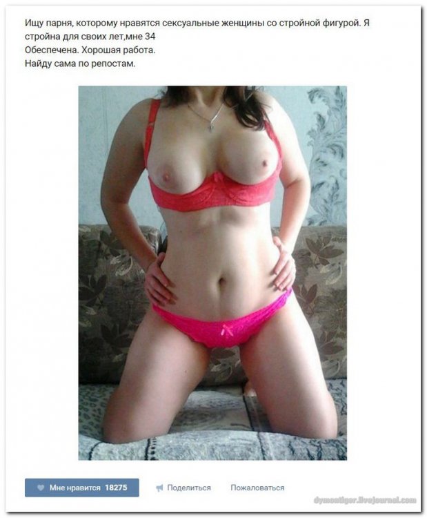 Дамам очень секаса не хватает (часть 21) 10-11-2016, 21:00 BigSisa Интересное 3 915 Очередная партия веселых дам из групп "Знакомства со зрелыми" и т.п., которые ищут в интернете приключения на свою задницу (и не только).Предыдущая часть здесь. Если Вам понравилось, поделитесь с друзьями в соцсетях: Предыдущая новость Следующая новость