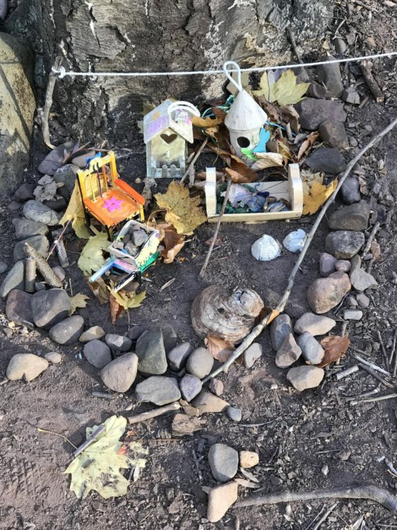 Один чувак отправился в лес на прогулку с собакой и обнаружил вокруг тропы массу занятных маленьких объектов — столы со стульями, лестницы, лавки. Словно гномы обустроили себе посреди зарослей деревню. Интересно, чьих рук это дело.