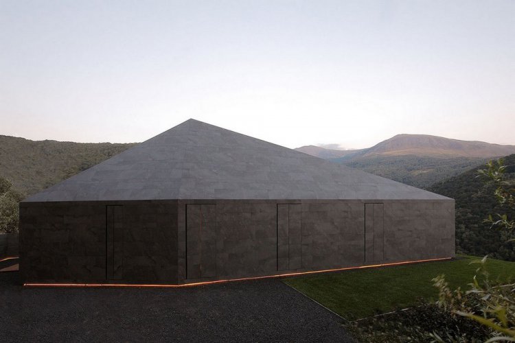 Проект был создан под местным строительным кодексом, который налагает на каждый дом наличие темно-серой скатной кровли для лучшей интеграции с окружающей средой. Исходя из этого ограничения, идея превратилась в создание монолита, камня в ландшафте, сделав кровли и фасады одного цвета. Лишь южная сторона, обращенная к долине и предоставляющая захватывающий вид через стеклянную стену, закрывающую жилую зону и открывающуюся в теплое время года, создавая лоджию.