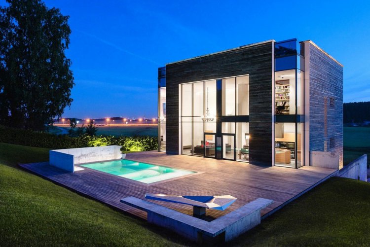 Постройка производит впечатление монолитного стеклянного куба, ограниченного с четырёх сторон массивными деревянными поверхностями. Это обеспечивается за счёт использования железобетонной конструкции в сочетании со структурным остеклением Schüco и облицованными лиственницей панелями. Древесина пропитана специальным составом, защищающим от ультрафиолетового излучения, но не препятствующим естественному старению.