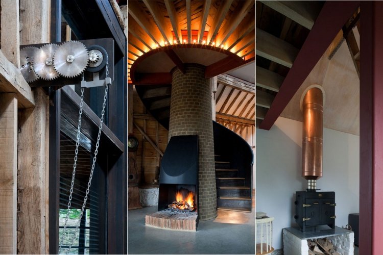 Архитекторы наполнили дом механизмами, которые приводятся вход посредством кинетической энергии. На месте входа установлена огромная стеклянная дверь, которая открывается горизонтально, если потянуть за цепи. По такому же принципу открываются и ставни.