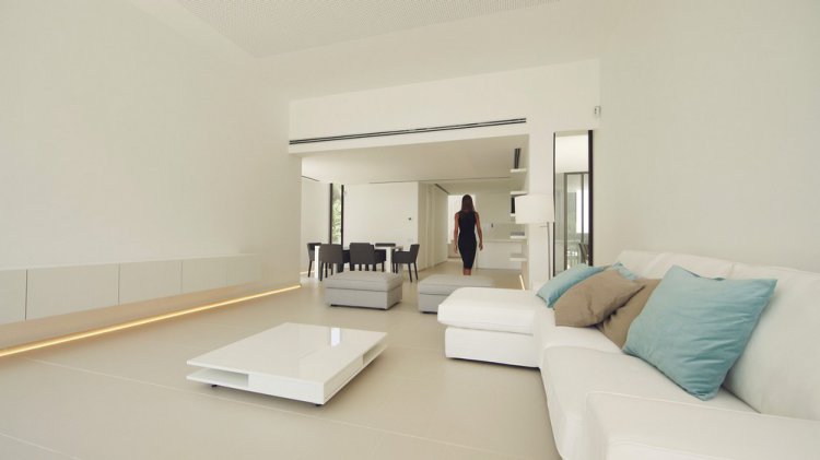 Размеры дома визуально расширяются за счёт добавления пространства сада, который служит в качестве идеального фона для виллы. Ландшафтный дизайн подчиняется той же концепции, что и конфигурация здания, следуя вытянутой форме участка и стремясь максимально вписать архитектуру в окружающий пейзаж.
