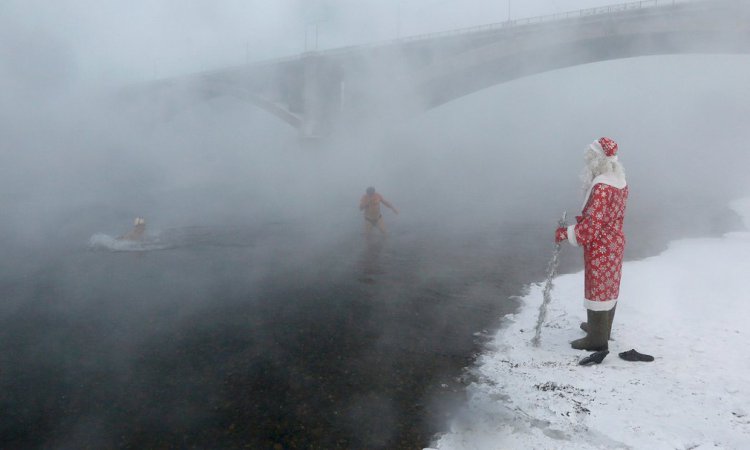 Человек, одетый в костюм Деда Мороза (аналог Санта-Клауса), стоит на берегу реки Енисей, когда пара мужчин из общества «Cryophile» (или попросту «моржи») принимают водные процедуры.