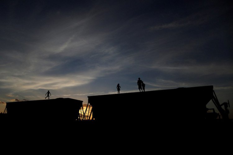 Ариэль да Силва, Ариана да Сильва, Даниэль да Сильва и их отец Раймундо Хосе да Силва играют на вершине вагона поезда недалеко от города Салгейру, штат Пернамбуку, на северо-востоке Бразилии, 26 октября 2016 года.