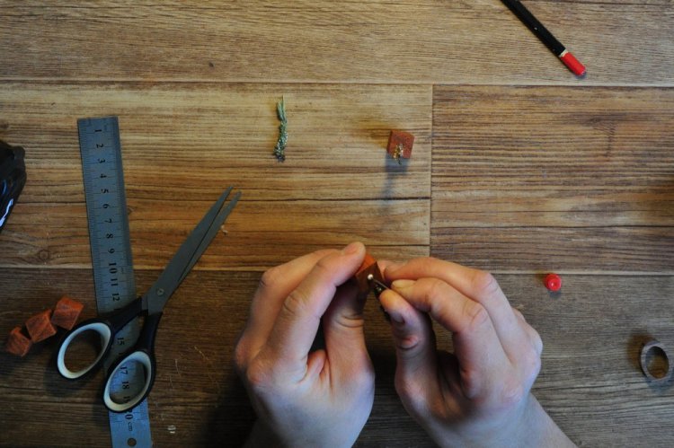 Для того чтобы при последующей заливке смолой веточки не всплыли, они были вклеены в деревянные заготовки. В центре кубика было просверлено небольшое глухое отверстие, в котором при помощи столярного клея ПВА был закреплен декоративный материал.