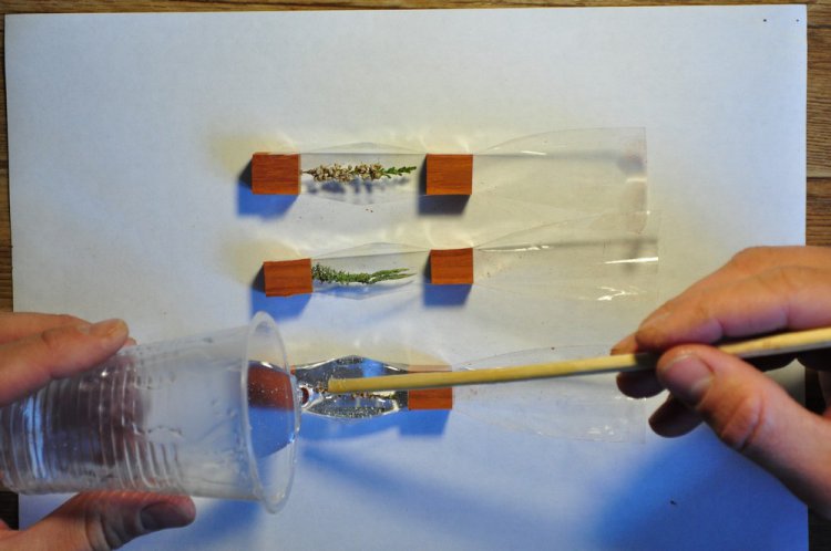Наступил самый ответственный момент – нужно, используя швейную иглу, убрать пузырьки воздуха, которые «прилипли» к веточкам. Пузыри находятся в толще смолы всплывут и без нашей помощи. Веточки вереска все-таки приподнялись с одного конца, ибо оказались слишком мягкими и легкими. Чтобы такого не случилось, а также при работе с наполнителем, не связанным с рамкой, стоит проводить заливку в два этапа – сначала заливается половина формы, на поверхность эпоксидки укладывается предмет который хотим увековечить, затем после застывания смолы форма заливается полностью.