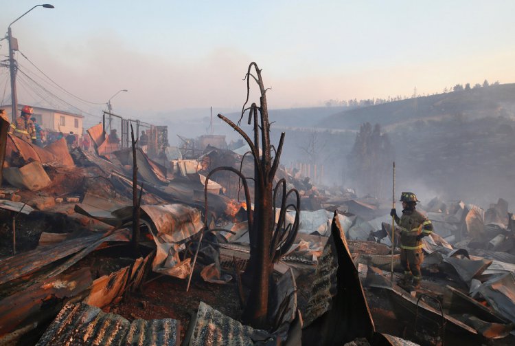 Не у всех Новый год начался хорошо. Недалеко от чилийского города-порта Вальпараисо вспыхнул крупный лесной пожар. Сильный ветер быстро распространил огонь на большую территорию, дымом заволокло улицы города. Сгорело более 100 домов, десятки семей потеряли все имущество, о человеческих жертвах не сообщается. Эти снимки сделал фотограф Родриго Гарридо (Rodrigo Garrido) 2 января 2017 года.