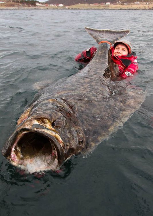 Этого 2-метрового палтуса поймали у побережья Лофотенских островов в Норвегии. Он был слишком большим, чтобы закинуть его на лодку, поэтому рыбак запрыгнул в воду, чтобы сделать фотографию.