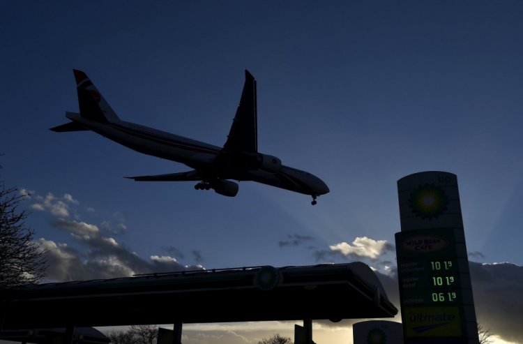 Пассажирский самолёт заходит на посадку над заправочной станцией ВР в аэропорту Хитроу в Лондоне. Литр неэтилированного бензина стоит 1,019 фунтов стерлингов (104 рубля).