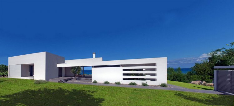 Основной из задач проектирования было размещение дома в окружении низкой растительности, виноградников и оливковых деревьев, при этом обеспечивая значительную площадь виллы видом на море. Это привело к линейному расположению здания, где социальные зоны занимают центральную часть, а спальни – обе стороны от центра. Положение, ориентация и высота здания делают его почти невидимым с улицы, в то время как оно полностью открыто морю.