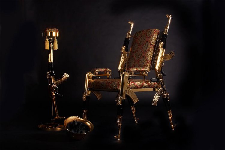 Художник Рейнир Вебер читал биографическую книгу о Михаиле Калашникове, когда к нему пришла муза. Он купил несколько АК-47 и собрал на их базе роскошный позолоченный стул из ткани из Лондона и Венеции. Теперь продает его за 127 000 долларов. В комплект также входит торшер и каска.