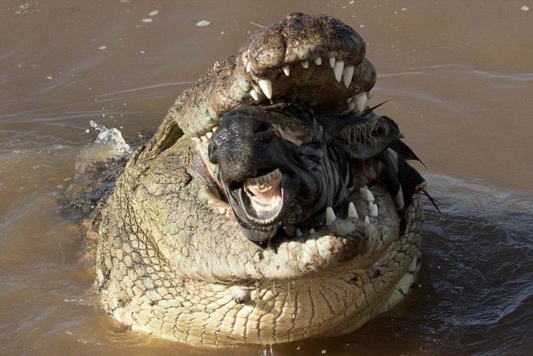 Жестокий момент: крокодил пытается проглотить голову зебры