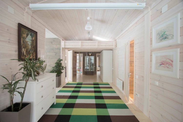 Модули сборного дома были изготовлены в Казани и доставлены уже с готовой отделкой, сантехникой, мебелью и электрооборудованием. Весь дом был собран всего за десять дней, причем было оказано минимальное негативное влияние на окружающий лес.