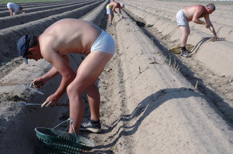 Рабочие трудятся на спаржевых фермах при любой погоде, в том числе под дождём и палящим солнцем. Фурберг, Германия.