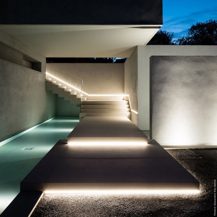 Интерьер дома выполнен в ослепительно белых тонах. Однако, яркая настенная живопись, разнообразные акценты и неординарные решения в освещении направлены на то, чтобы смягчить холодную непорочность белого. Так, подсветка лестницы с мини-бассейном, ведущей в патио, абстрактная живопись и бассейн, где не видна граница между «зеркалом воды» и полом, задают современный тон и способны поразить даже самого искушенного любителя комфортного отдыха.