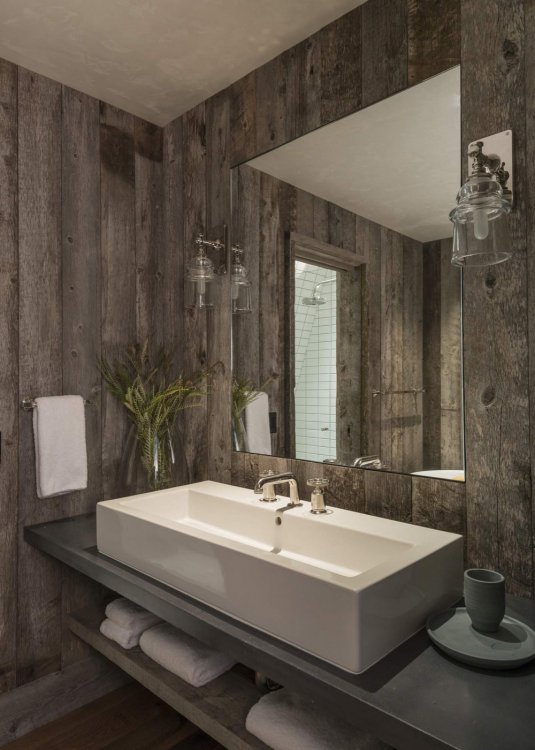 Второй этаж занимают спортзал и номер для гостей с мини-кухней, спальней и ванной комнатой. Интерьер сохраняет эстетику сарая с рекуперированными дубовыми полами, дощатым потолком, открытыми фермами и раздвижными дверями. Натуральная древесина, которой отделаны все помещения, позволяет окружающему ландшафту и интерьеру слиться в одну стильную композицию.