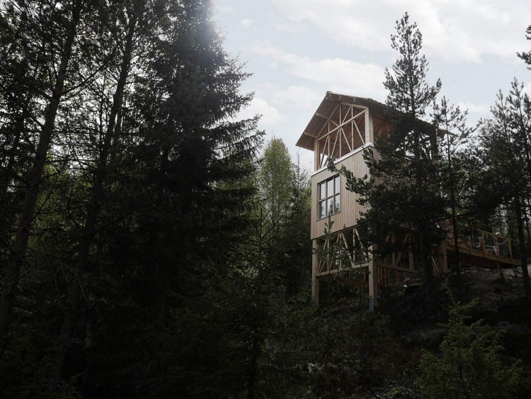 Он стоит на деревянном каркасе и органично вписывается в окружающий сосновый лес, не нарушая естественного природного баланса. Высота двухэтажного дома чуть больше 10 метров, а общая площадь составляет 28 квадратных метров. Для строительства и отделки помещений была использована древесина сосны и ели, а также фанера из березы. По старой традиции нордического строительства стены были изолированы льняными волокнами.
