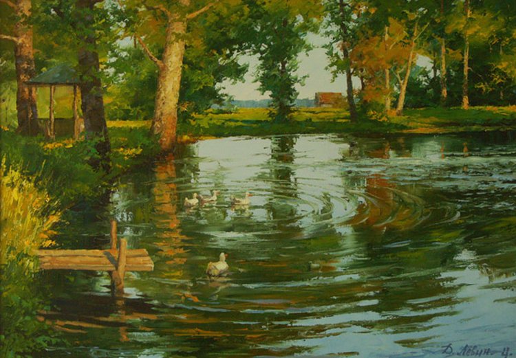 В живописи Дмитрия Лёвина встречаются разные мотивы и все времена года. Мы отобрали деревенские пейзажи, дышащие полевыми цветами, лесной прохладой, утренней свежестью и созерцательным настроением.