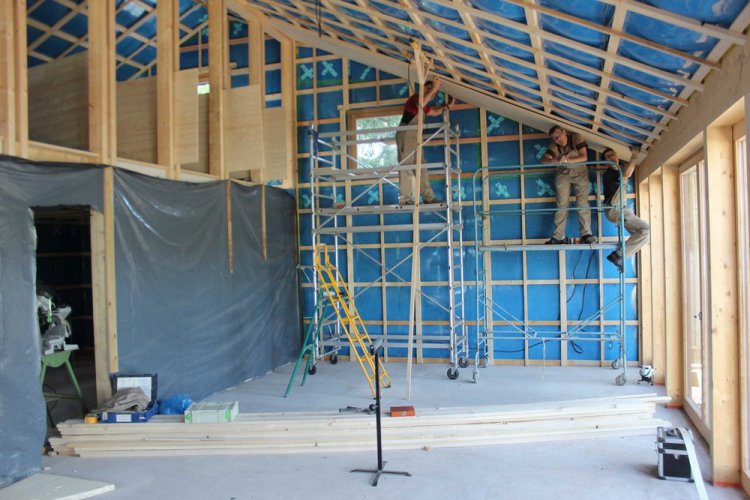 Практически все пространство в доме от пола до потолка обшито натуральной древесиной. В качестве теплоизоляционного материала выступают целлюлозная вата и древесное волокно.