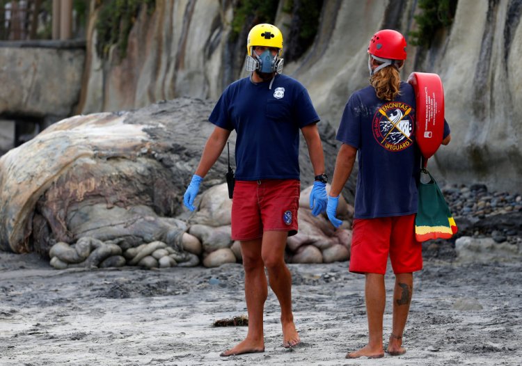 Тушу мертвого кита выбросило на пляж в Калифорнии, США, 18 июля 2016. Рабочим и спасателям понадобилась тяжелая техника, что бы убрать 22-тонное мертвое тело с пляжа. Причина гибели гигантского морского млекопитающего осталась неизвестна.