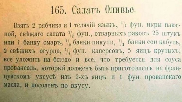 Для нас его название звучит по-французски, и неудивительно: ведь придумал блюдо французский повар Люсьен Оливье и хранил рецепт в тайне до самой смерти. Но салат действительно можно считать русским, так как работал этот повар в Москве и изобретал свой салат для русских посетителей ресторана «Эрмитаж» в 1860-х годах. «Считалось особым шиком, когда обеды готовил повар-француз Оливье, еще тогда прославившийся изобретенным им салатом Оливье, без которого обед не обед и тайну которого не открывал. Как ни старались гурманы, не выходило: то, да не то», — вспоминал Владимир Гиляровский в книге «Москва и москвичи».